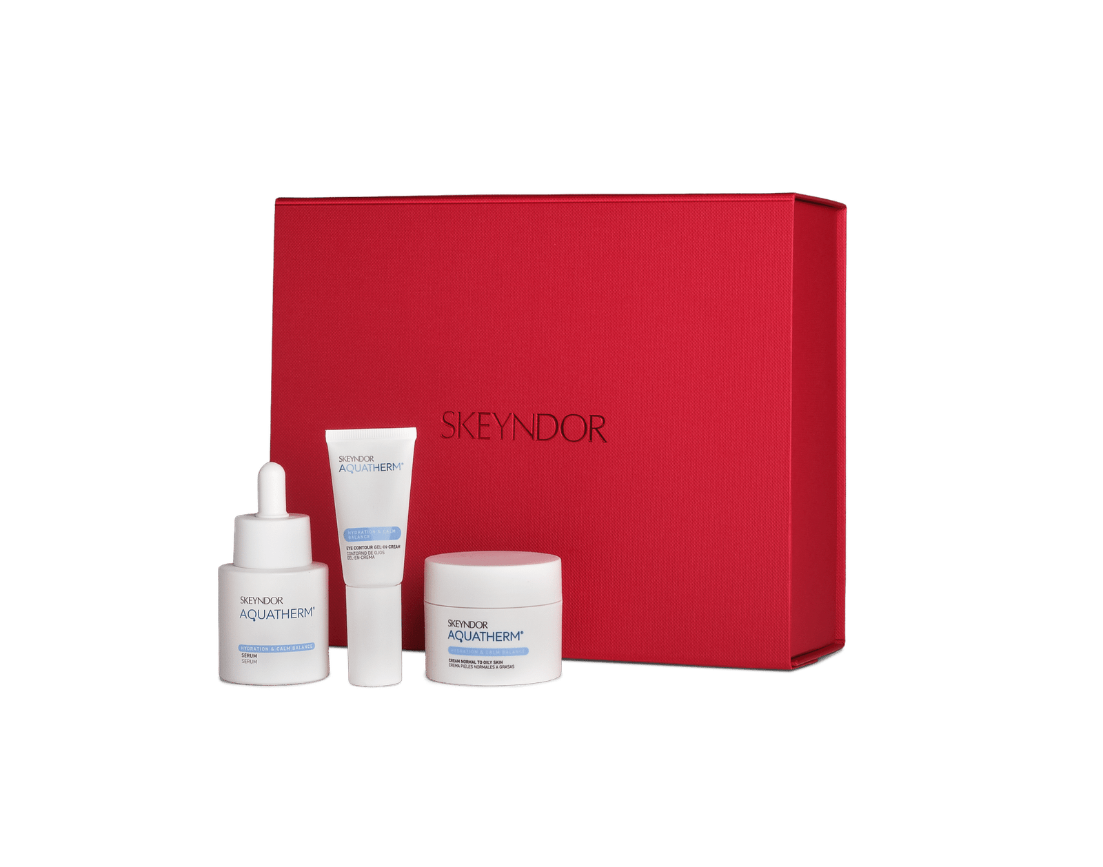 The set includes the Aquatherm Cream normal to oily skin (50 ml). This formula help to progressively normalise sensitive skin, strengthening it against external aggressions and stimulating the skin’s microbiota. It also contains the Aquatherm Serum (30 ml), which delivers an anti-redness and anti-inflammatory effect, leaving the skin hydrated, more even and soothed. Finallly contains a gentle gel-in-cream  the eye-contourn ( 15ml) formulated to treat the delicate eye contour area of sensitive skin.